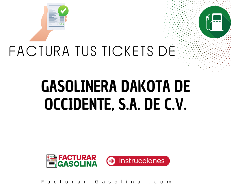 Si tienes tu ticket de pago de gasolina de GASOLINERA DAKOTA DE OCCIDENTE, S.A. DE C.V. y requieres factura, aquí puedes acceder directo al portal de facturación GASOLINERA DAKOTA DE OCCIDENTE y las instrucciones para generar tu CFDI. ¿Problemas ? Revisa abajo la información de ayuda.