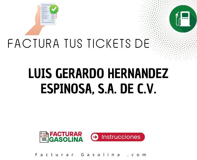 Si tienes tu ticket de pago de gasolina de LUIS GERARDO HERNANDEZ ESPINOSA, S.A. DE C.V. y requieres factura, aquí puedes acceder directo al portal de facturación LUIS GERARDO HERNANDEZ ESPINOSA y las instrucciones para generar tu CFDI. ¿Problemas ? Revisa abajo la información de ayuda.