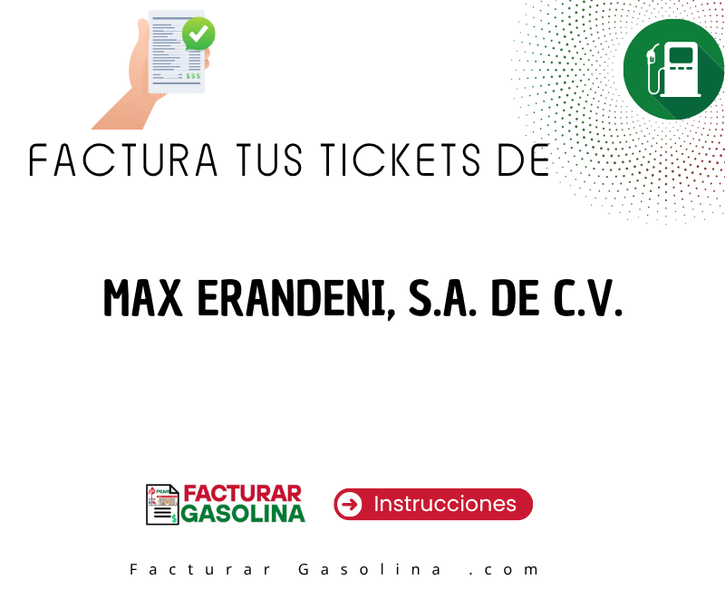 Si tienes tu ticket de pago de gasolina de MAX ERANDENI, S.A. DE C.V. y requieres factura, aquí puedes acceder directo al portal de facturación MAX ERANDENI y las instrucciones para generar tu CFDI. ¿Problemas ? Revisa abajo la información de ayuda.
