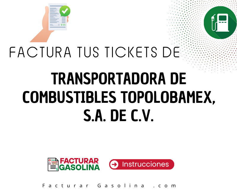 Si tienes tu ticket de pago de gasolina de TRANSPORTADORA DE COMBUSTIBLES TOPOLOBAMEX, S.A. DE C.V. y requieres factura, aquí puedes acceder directo al portal de facturación TRANSPORTADORA DE COMBUSTIBLES TOPOLOBAMEX y las instrucciones para generar tu CFDI. ¿Problemas ? Revisa abajo la información de ayuda.
