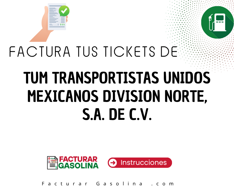 Si tienes tu ticket de pago de gasolina de TUM TRANSPORTISTAS UNIDOS MEXICANOS DIVISION NORTE, S.A. DE C.V. y requieres factura, aquí puedes acceder directo al portal de facturación TUM TRANSPORTISTAS UNIDOS MEXICANOS DIVISION NORTE y las instrucciones para generar tu CFDI. ¿Problemas ? Revisa abajo la información de ayuda.